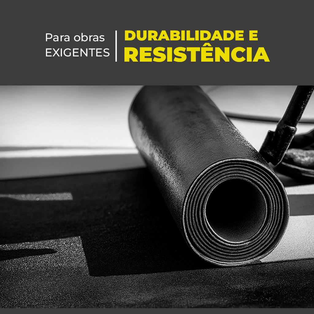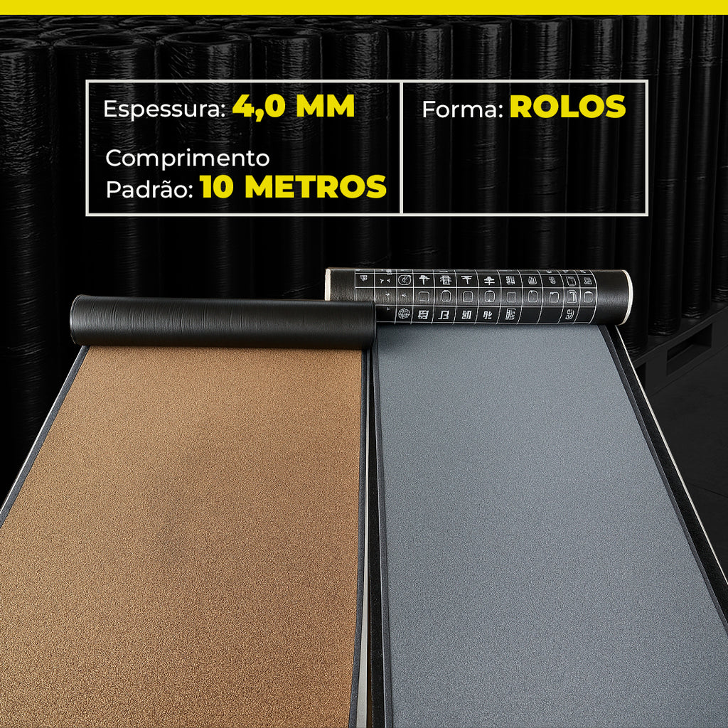 Disponível em espessura de 4,0 mm e comprimento padrão de 10 metros, essa membrana impermeável de cor preta é fornecida em paletes, com peso bruto por lote de até 1.000 kg.
